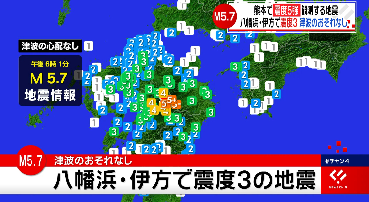 熊本で最大震度5強の地震 愛媛県内では八幡浜市と伊方町で震度3を観測 津波の心配なし