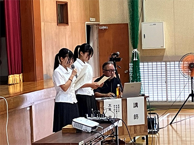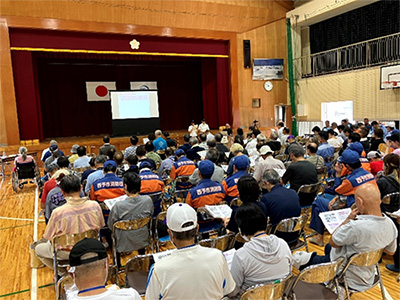 リスクと備えを学ぼう」と題した講演と、地元県立宇和高校の「災害レスQ班の活動について」発表をしていただきました。会場には避難訓練に参加した地元の皆さんや消防団など関係者合わせて約200人が、熱心に受講されました。