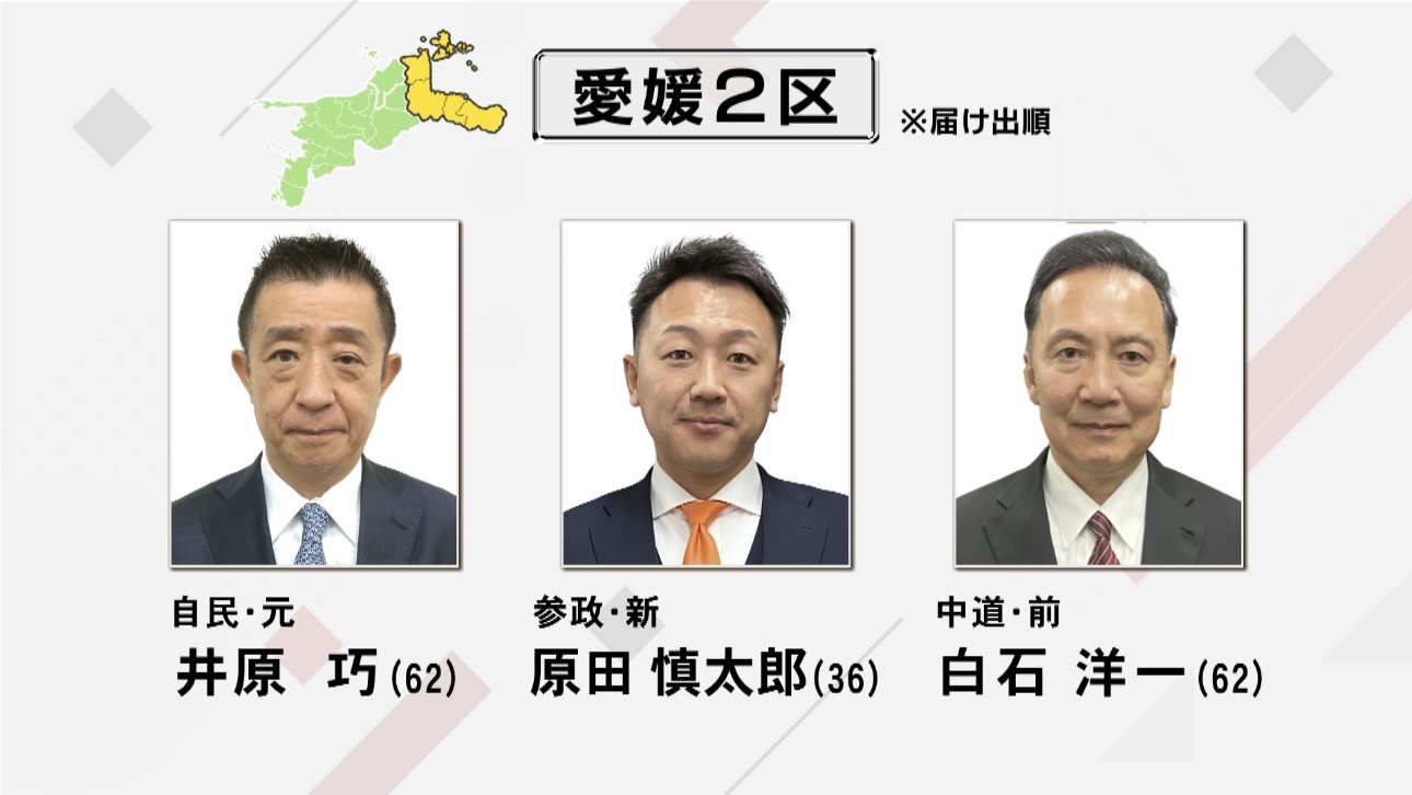 松山市以外の中予と南予全域が選挙区の愛媛3区には前職と新人合わせて3人が立候補しました。