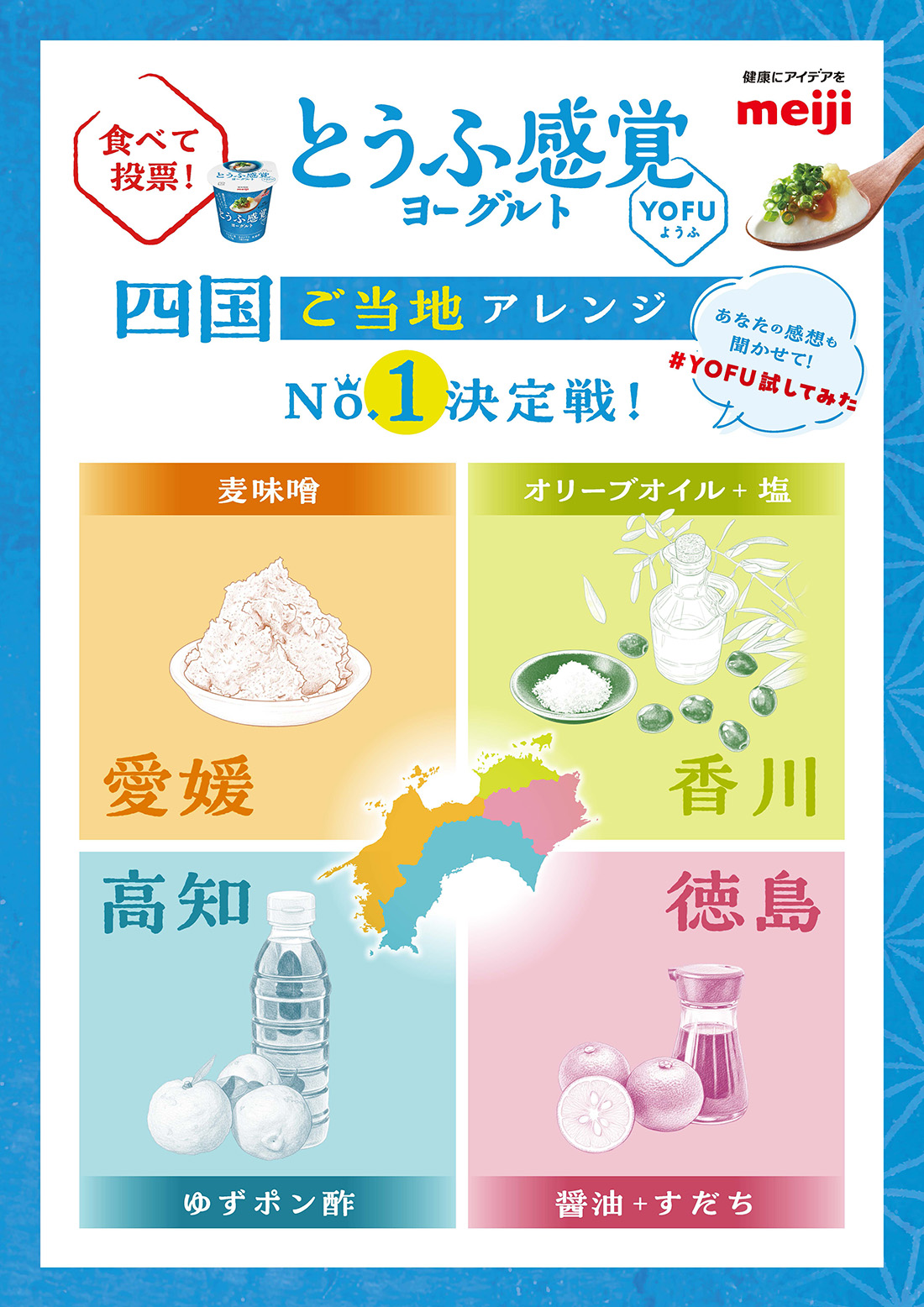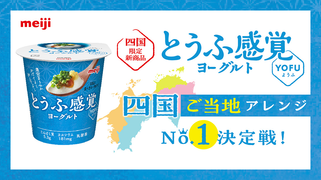 新商品「明治とうふ感覚ヨーグルト YOFU」の試食投票イベントを四国4県で開催します。四国4県のご当地調味料アレンジYOFUを試食して、気に入ったものに投票をしてください。
