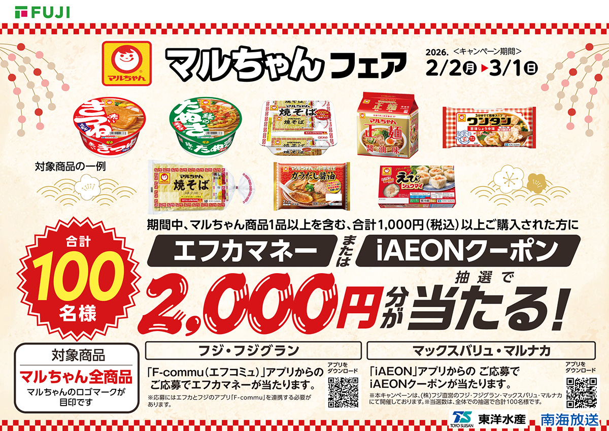 キャンペーン期間中、フジ・フジグラン・マックスバリュ・マルナカ各店にてマルちゃん商品1品以上を含む税込1,000円以上お買い上げの方で、フジ・フジグランはフジアプリ「エフコミュ」から、マックスバリュ・マルナカはイオングループアプリ「iAEONアプリ」から応募すると抽選でエフカマネーまたはiAEONクーポンをプレゼント(2,000円×100名)