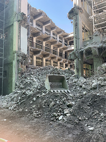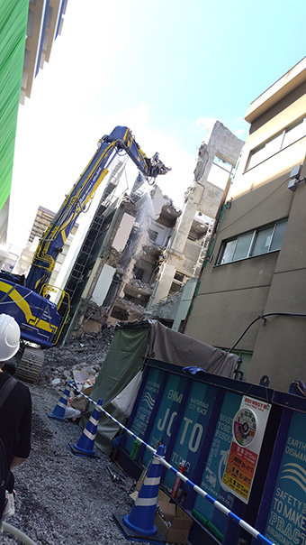 一気に壊したら瓦礫などが落ちてきて危ないので、ハサミの機械で少しずつ小さく壊していくそうです。安全対策の表みたいなのが現場にあって、作業員の安全をしっかり考えながらお仕事しているんだなと感じました。