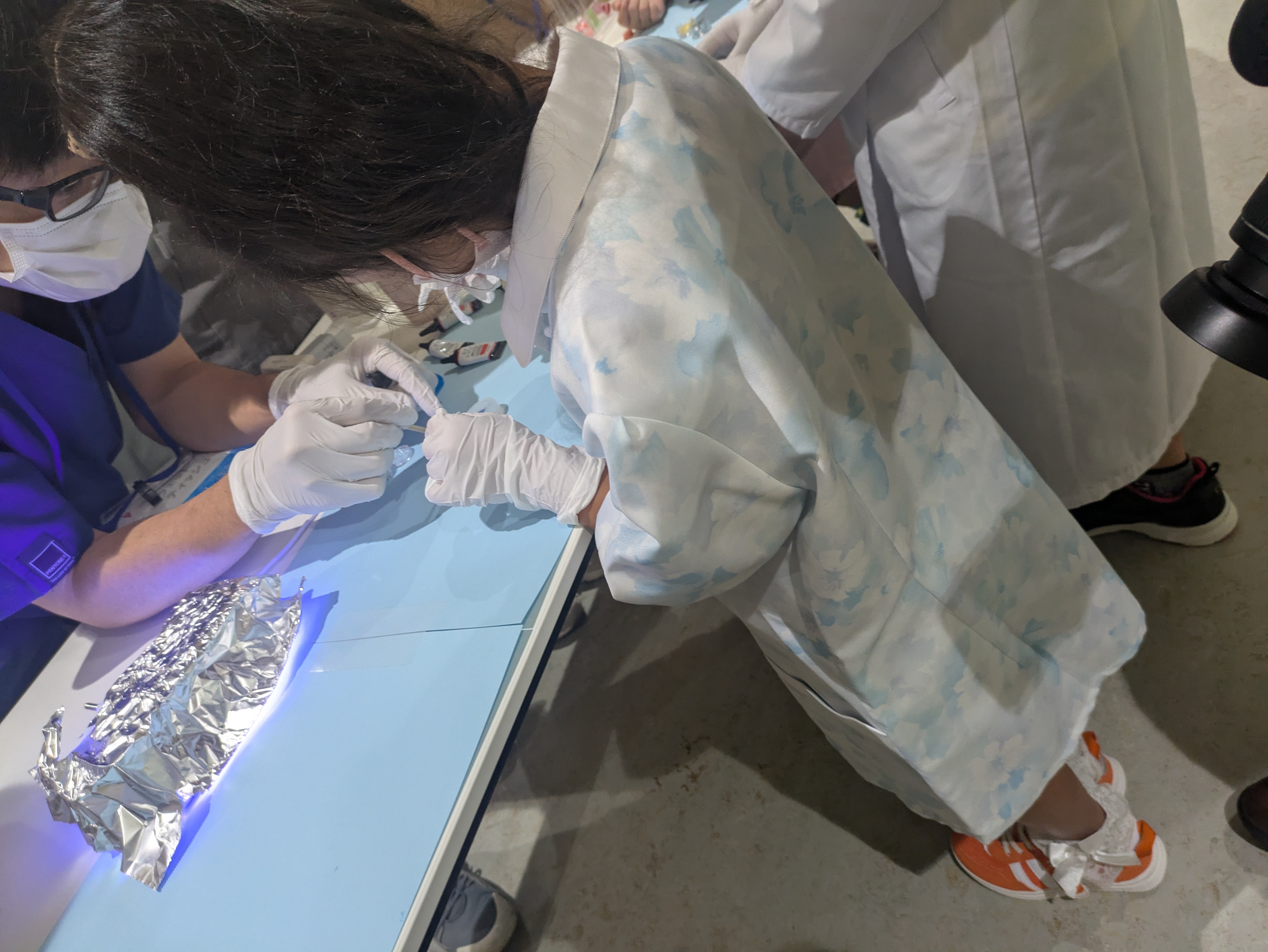 そう レーザーで肉を焼いたり、人形の虫歯を削って詰めたり、歯を抜いたりしました。先生に教えてもらいながら、歯科治療用の本物の機械を使いました。また、歯の神経治療などに使う電子顕微鏡でお札に隠された文字を探しました。