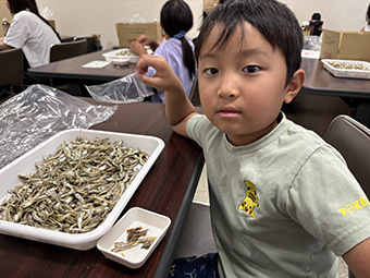 あきくん いわしに混じっていた、イカやカニやアジやふぐを見つけるお仕事が楽しかったです。花チーズにピザの味付けをして、おいしかったです!スーパーで、会社が作ったイカのおつまみを見つけて、嬉しかったです。