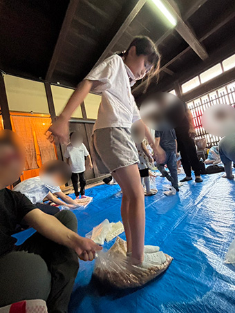 隼 みその材料の大豆や米こうじを踏む感触が気持ちよかったです。カビを生やさずおいしいみそができるよう、お世話します。