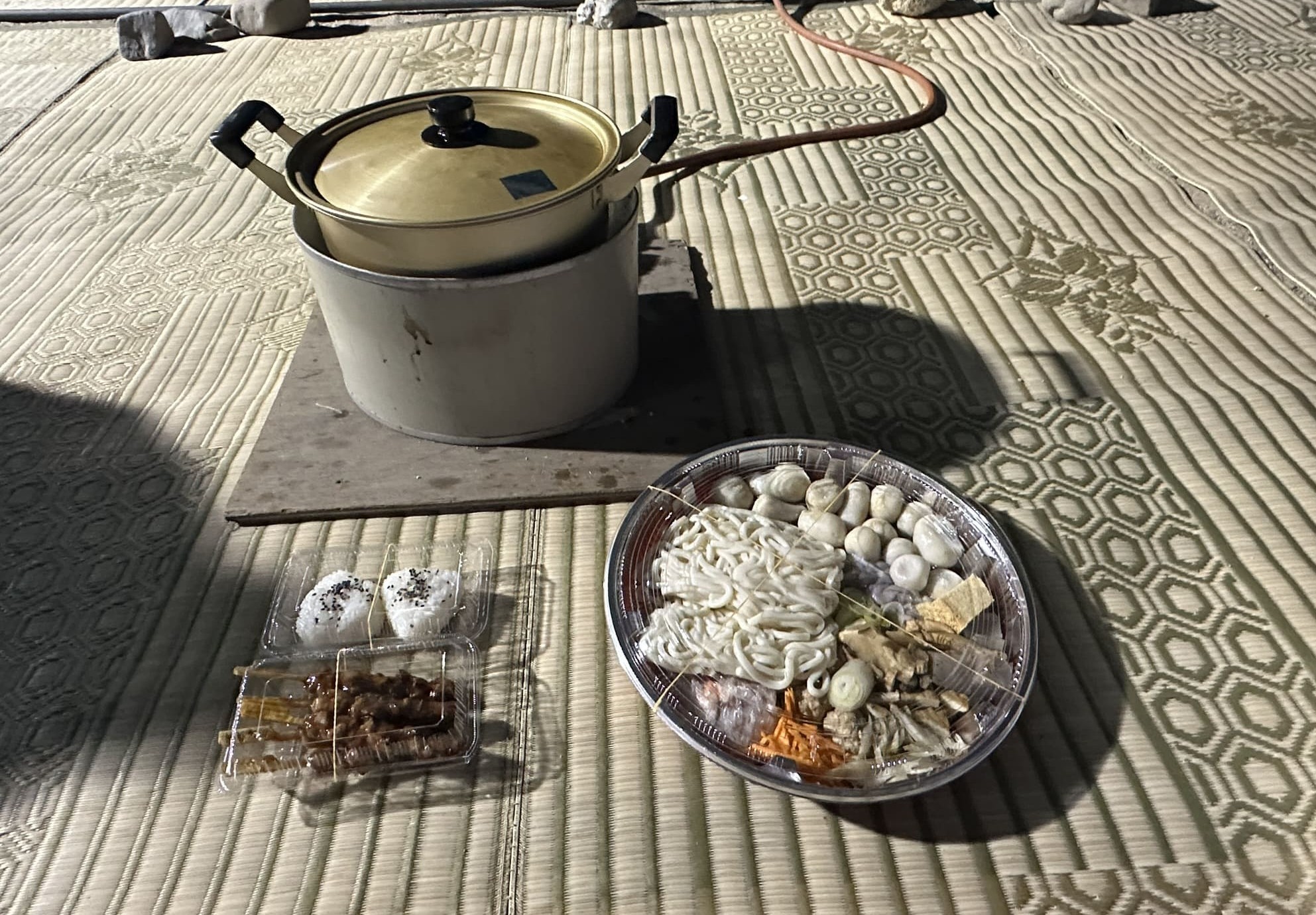 下の写真が「貸していただいたコンロと鍋」「芋炊きセット2人前+締めのうどん2人前」「焼き鳥1人前」「おにぎり2人前」の全容となります。