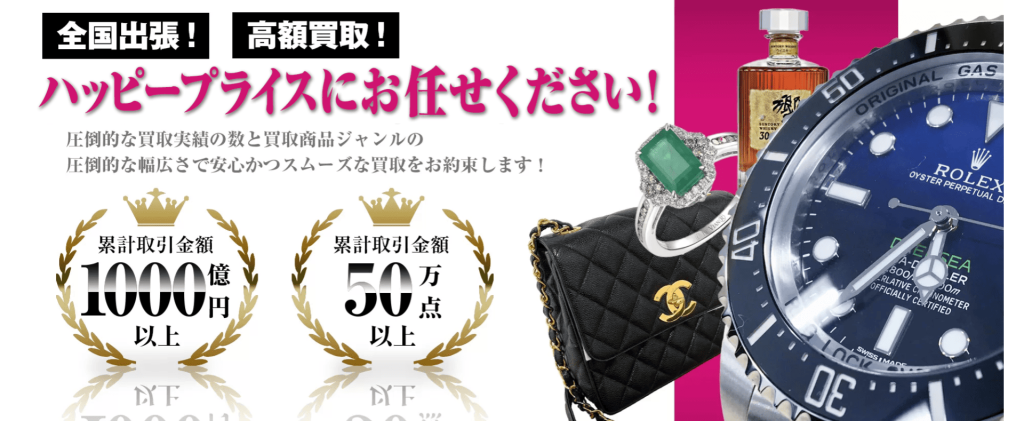 店頭買取・出張買取・宅配買取に対応しており、LINEや電話、メールで気軽に査定・相談ができます。また、ハッピープライス(旧グッドディール)が蓄積してきたデータをもとにAI買取ロボでの査定も行っています。