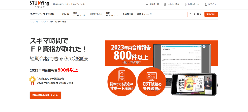 動画視聴やテキスト学習など全てスマホで学習でき、隙間時間で勉強したい人に最適です。受講料の割引キャンペーンも多く行っています。