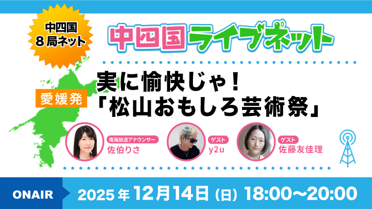 12/14(日)「中四国ライブネット」は愛媛発!現在開催中の「松山城おもしろ芸術祭 城彩」の参加アーティストが登場し、作品への想いや魅力を届ける。