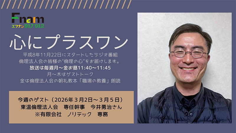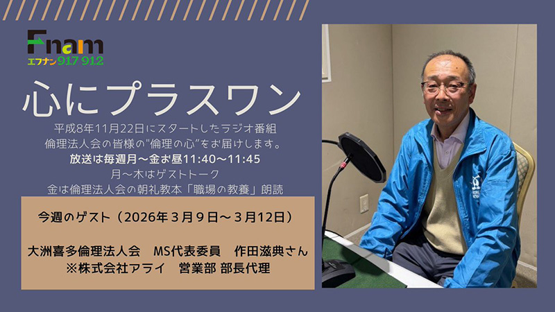 平成8年11月22日にスタートしたラジオ番組「心にプラスワン」倫理法人会の皆様の"倫理の心をもっとたくさんの人に届けたい"という熱い思いを込めて。毎週月曜から金曜のお昼11:40~11:45に放送中。たくさんの人の心に"プラスワン"を届けます!