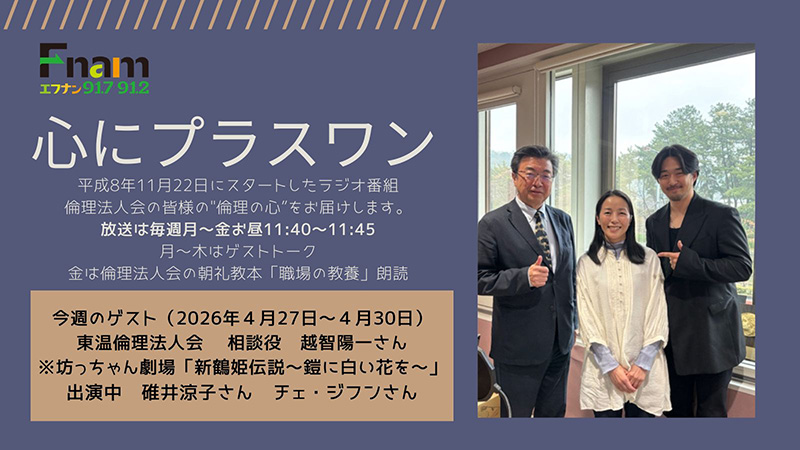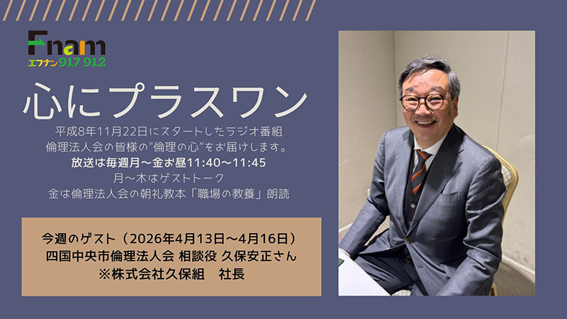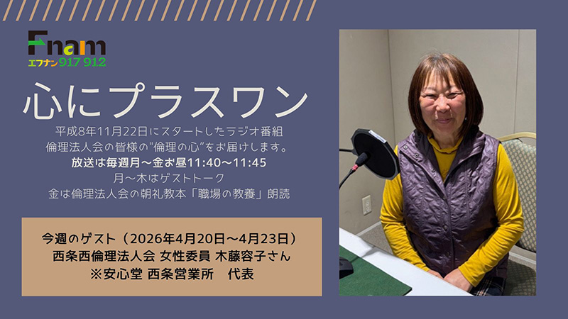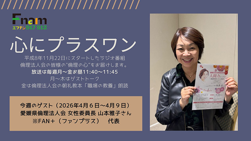 平成8年11月22日にスタートしたラジオ番組「心にプラスワン」倫理法人会の皆様の"倫理の心をもっとたくさんの人に届けたい"という熱い思いを込めて。毎週月曜から金曜のお昼11:40~11:45に放送中。たくさんの人の心に「プラスワン」を届けます!