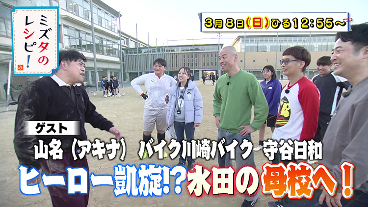 3/8(日)12:55~のミズタのレシピ!は「ゲスト:山名(アキナ)・バイク川崎バイク・守谷日和 ヒーロー凱旋!?水田の母校へ!」